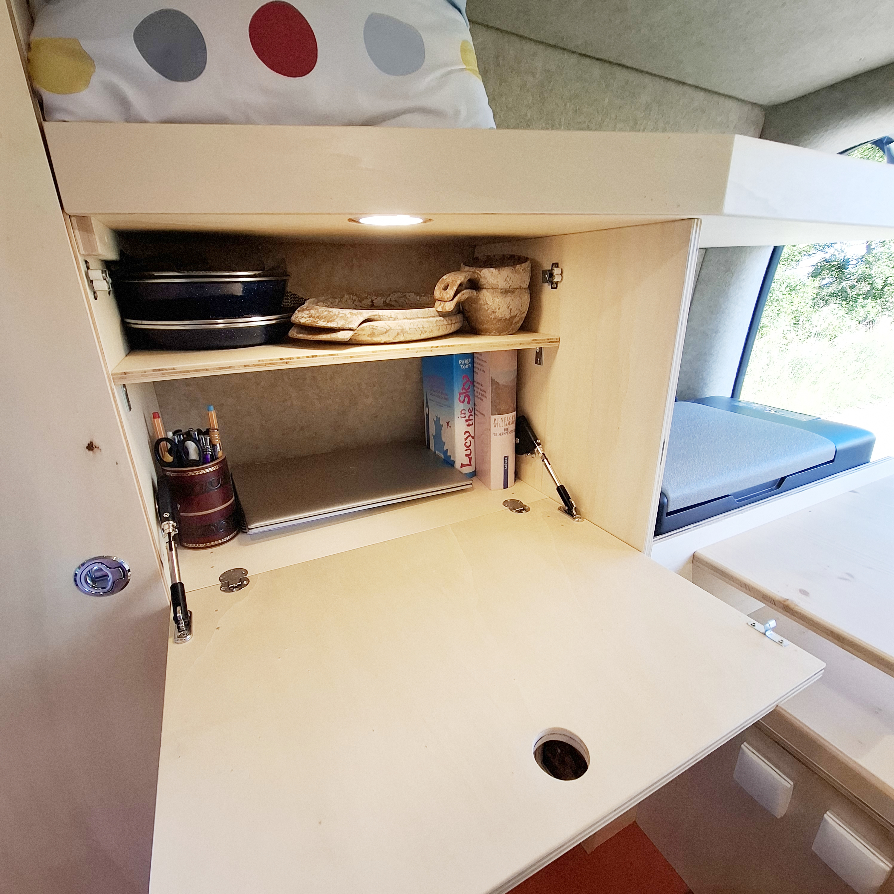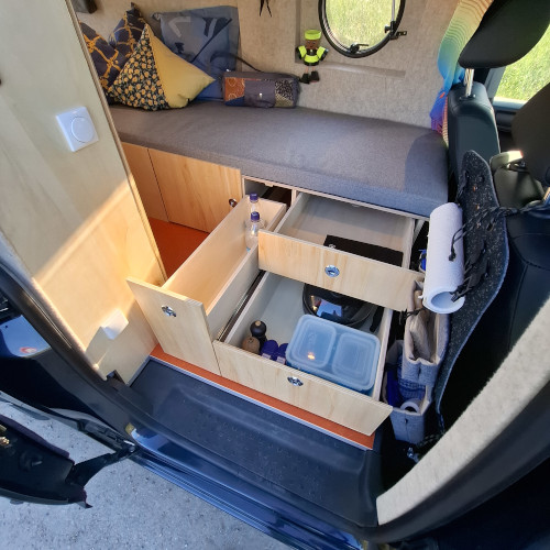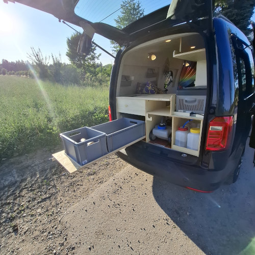 Für noch mehr Stauraum haben wir einen Schwerlastauszug mit 100 cm unter dem Bett verbaut und mit praktischen Euroboxen ausgestattet. Im ausgezogenen Zustand ist dieser auch als Arbeitsfläche für die Küche zu verwenden.