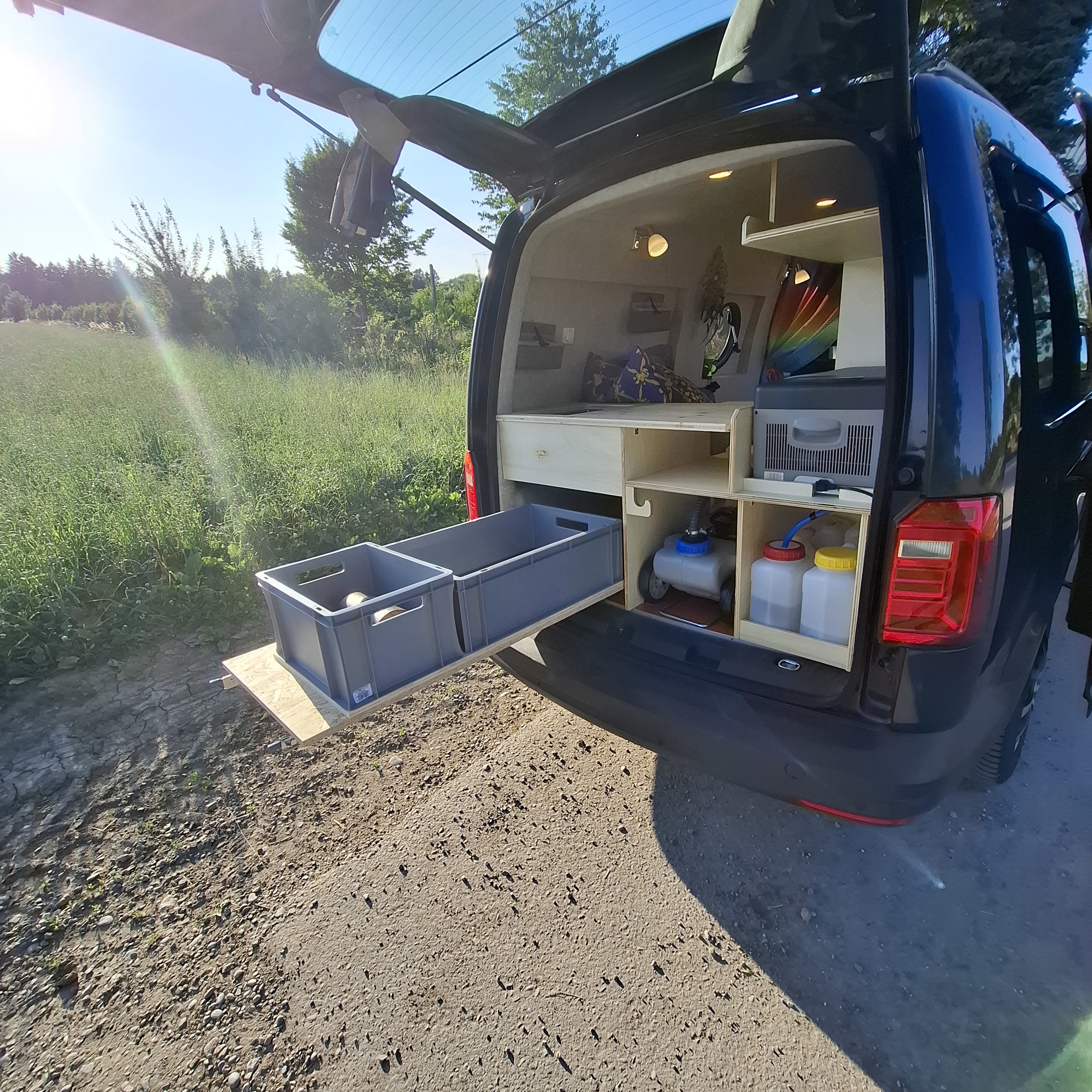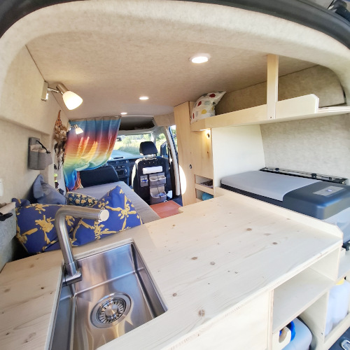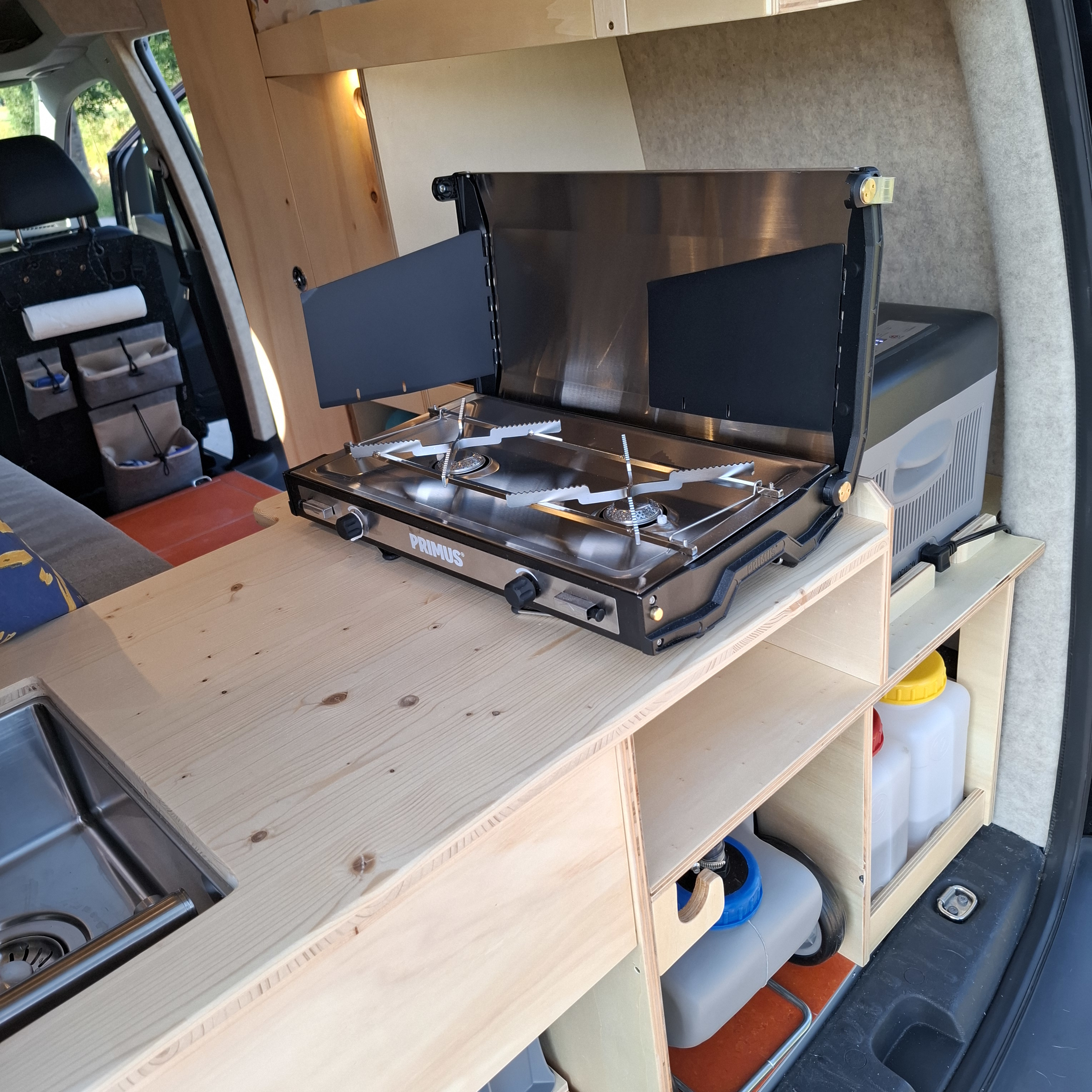 Die Kompressor-Kühlbox kann sowohl mit 12 V als auch mit 230 V betrieben werden und kann wie der Kocher und die Spüle von innen und von außen genutzt werden. Von der Spüle aus kann auch eine Aussendusche realisiert werden.