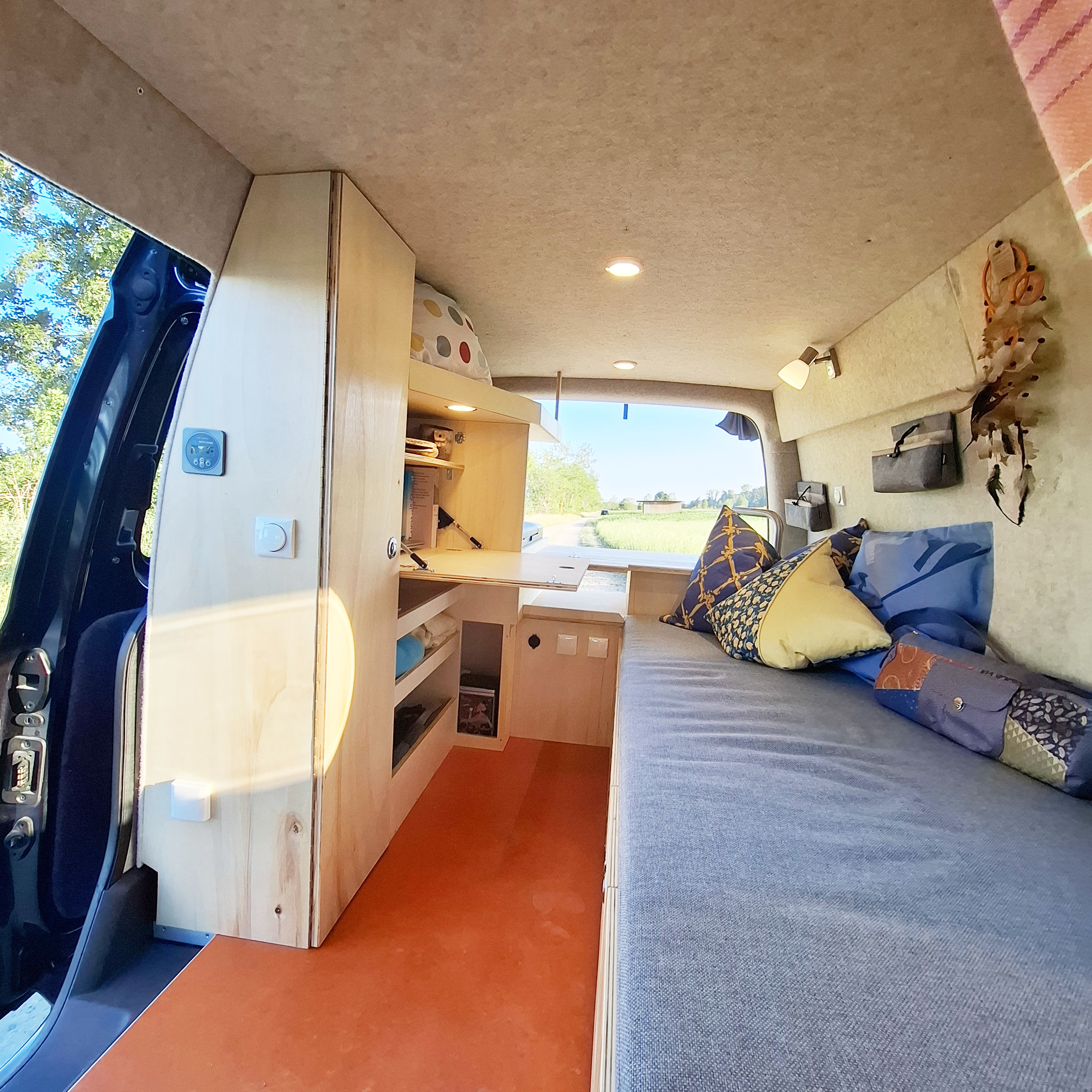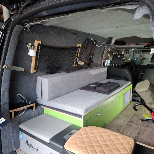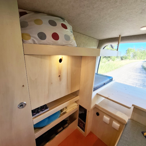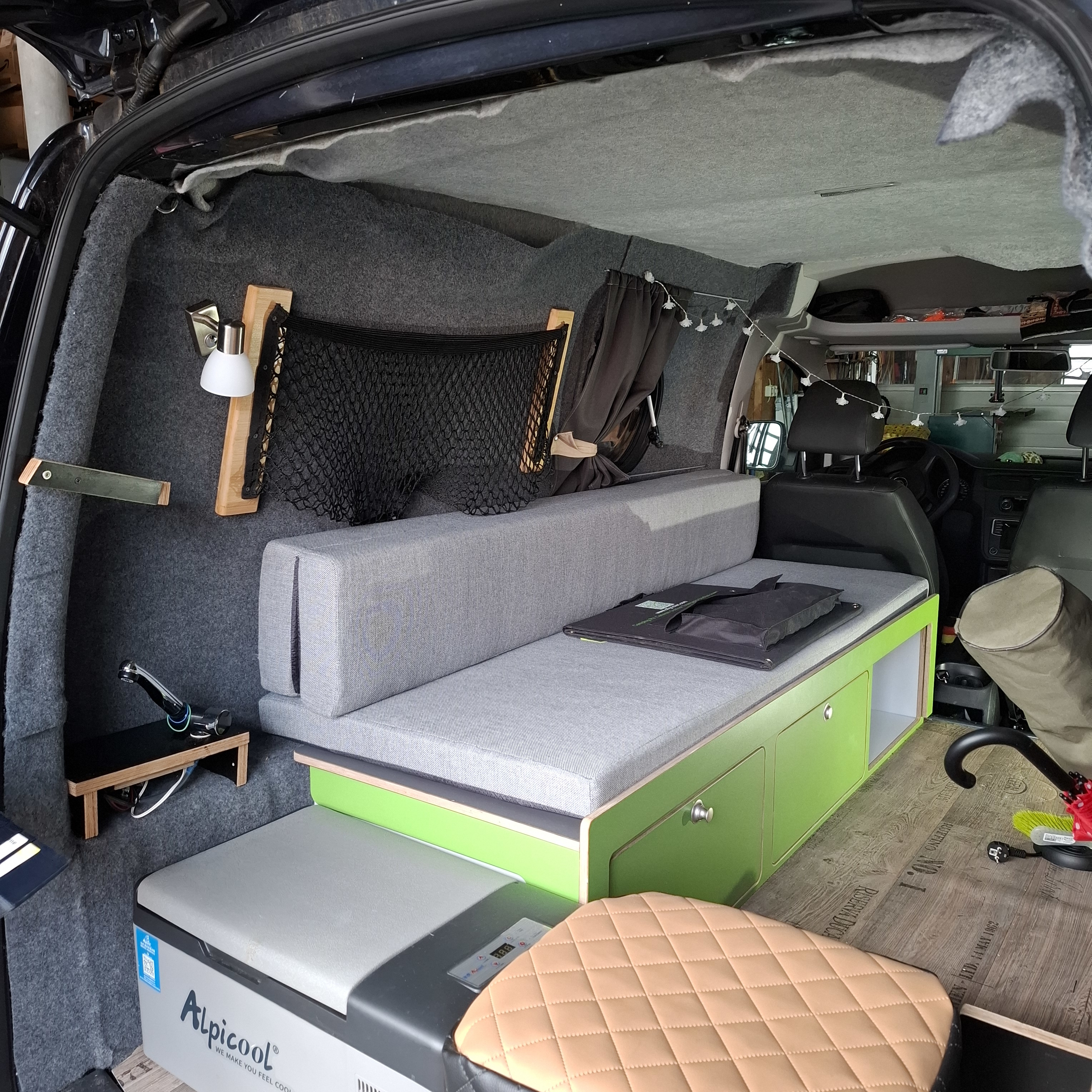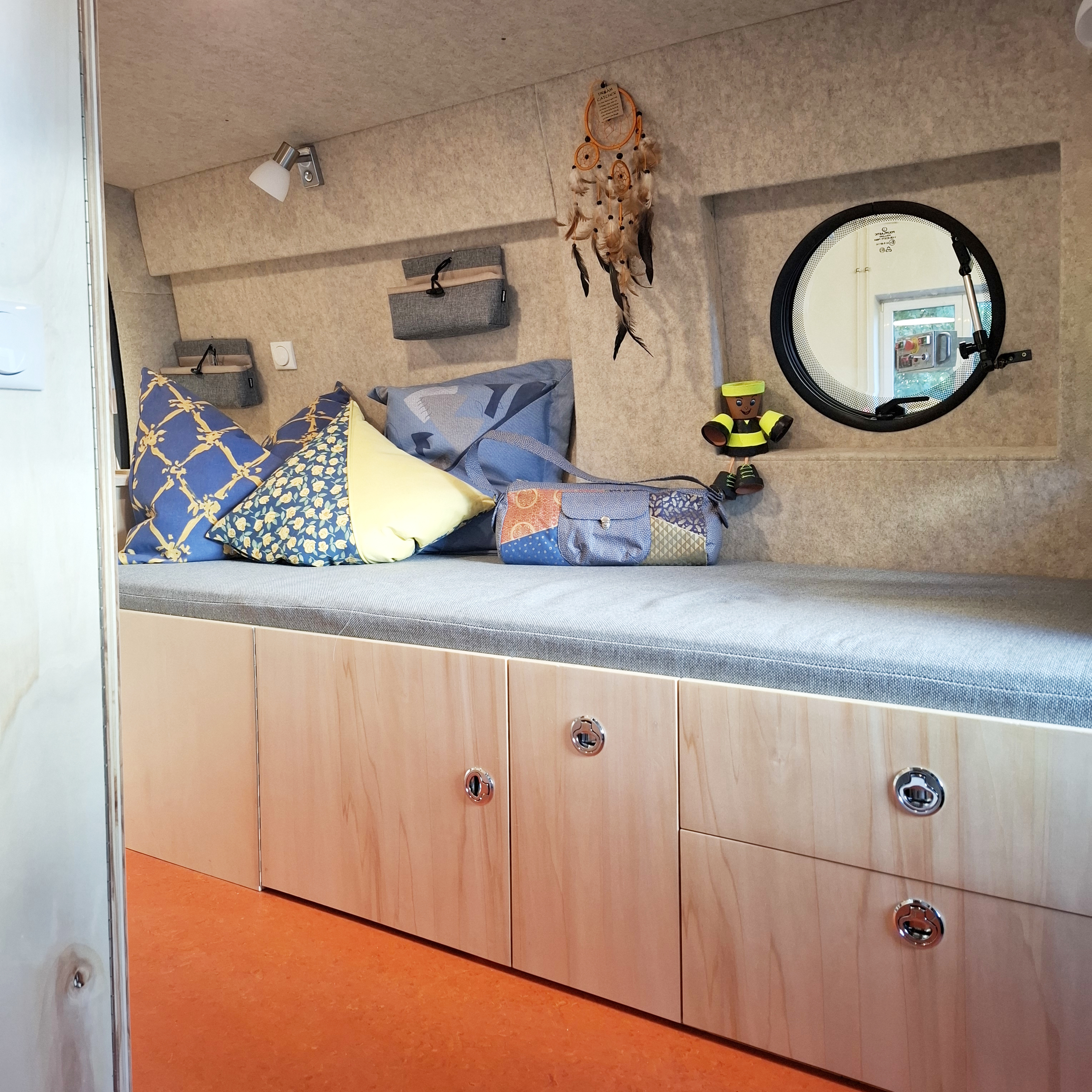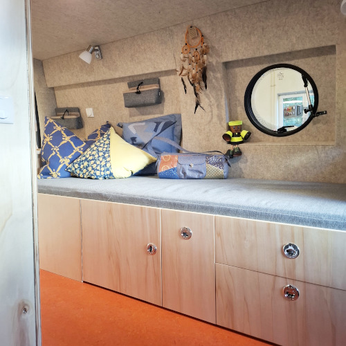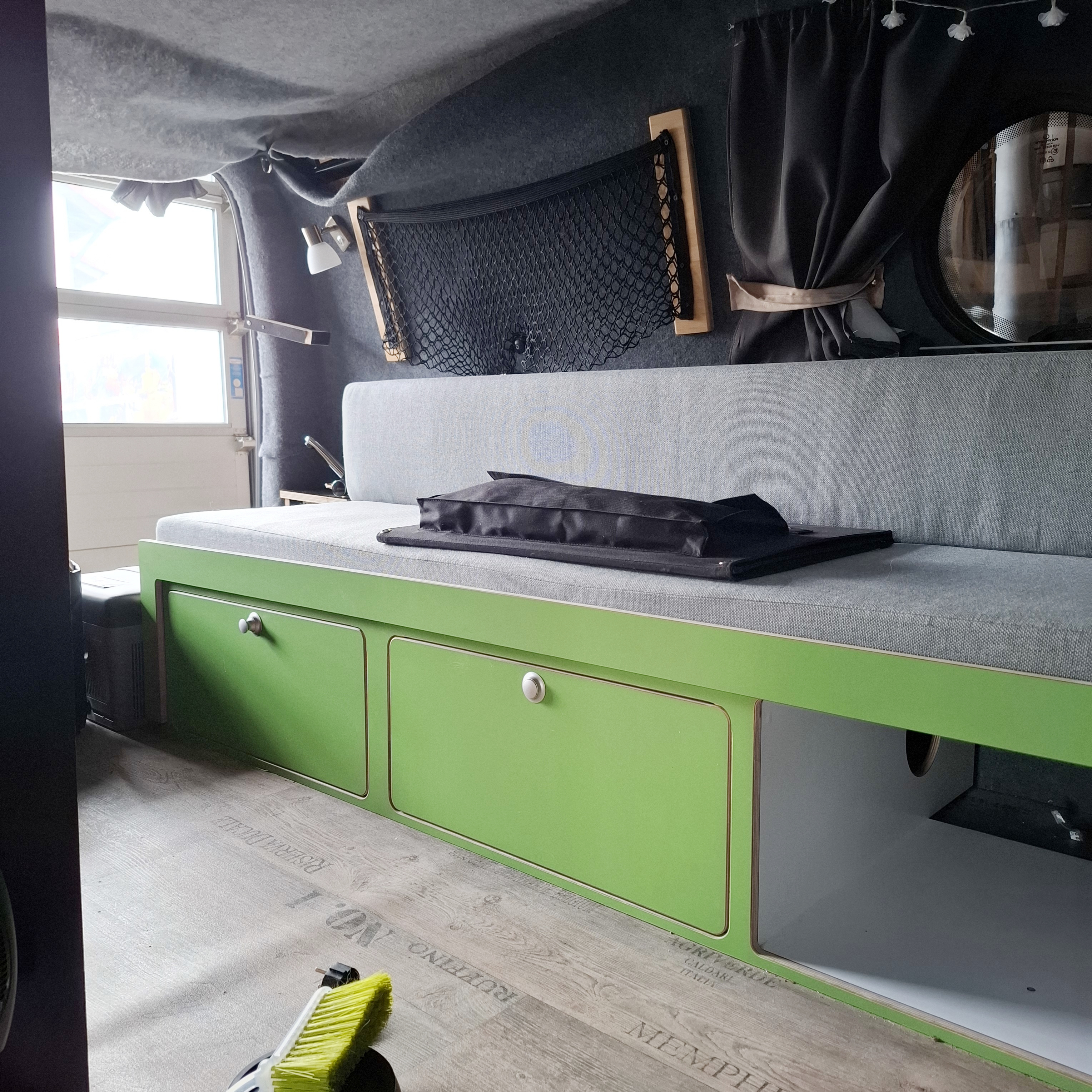 Die Seitenwände und der Himmel wurden von uns isoliert, mit Pappelsperrholz verkleidet und mit einem freundlichen, hellen Filz beklebt.