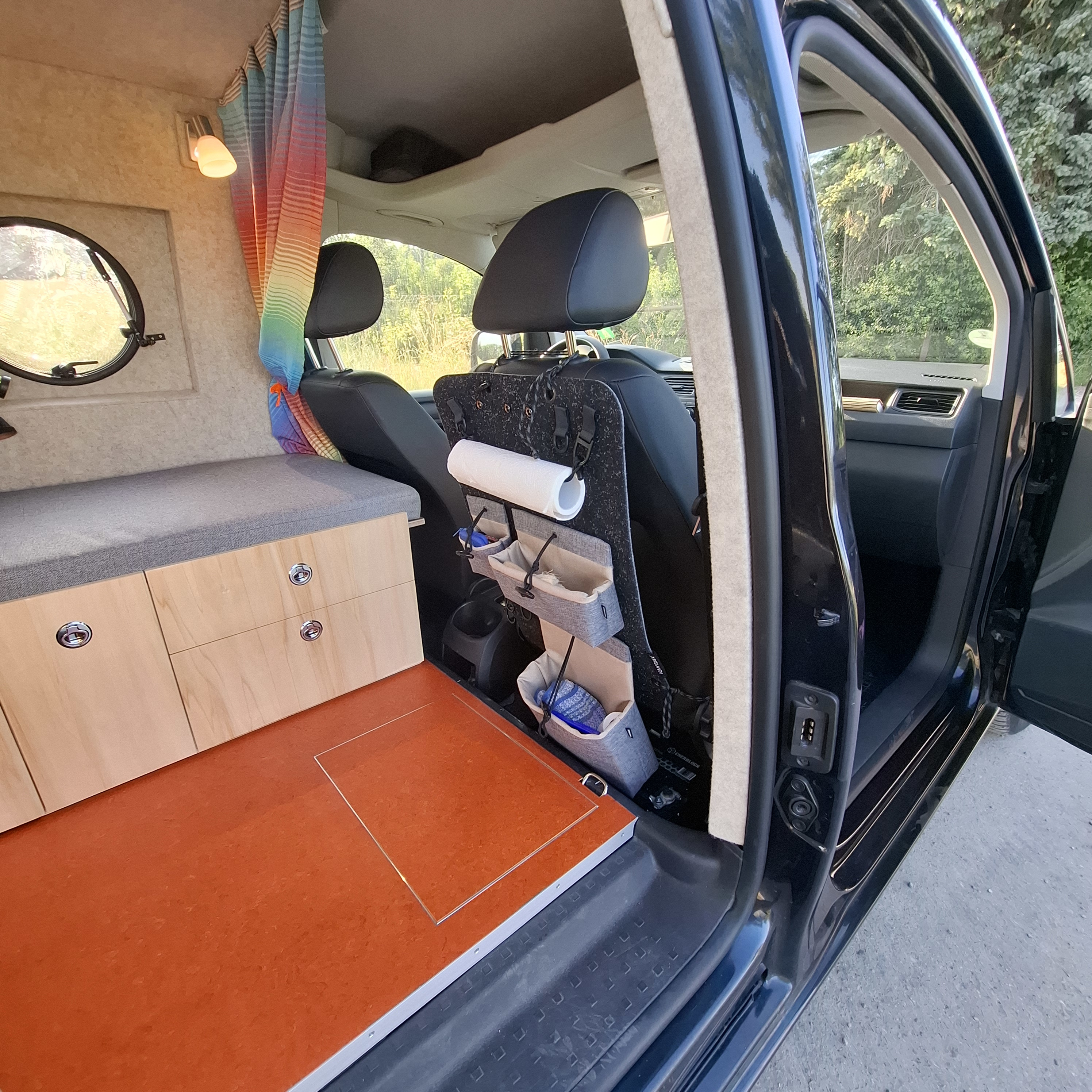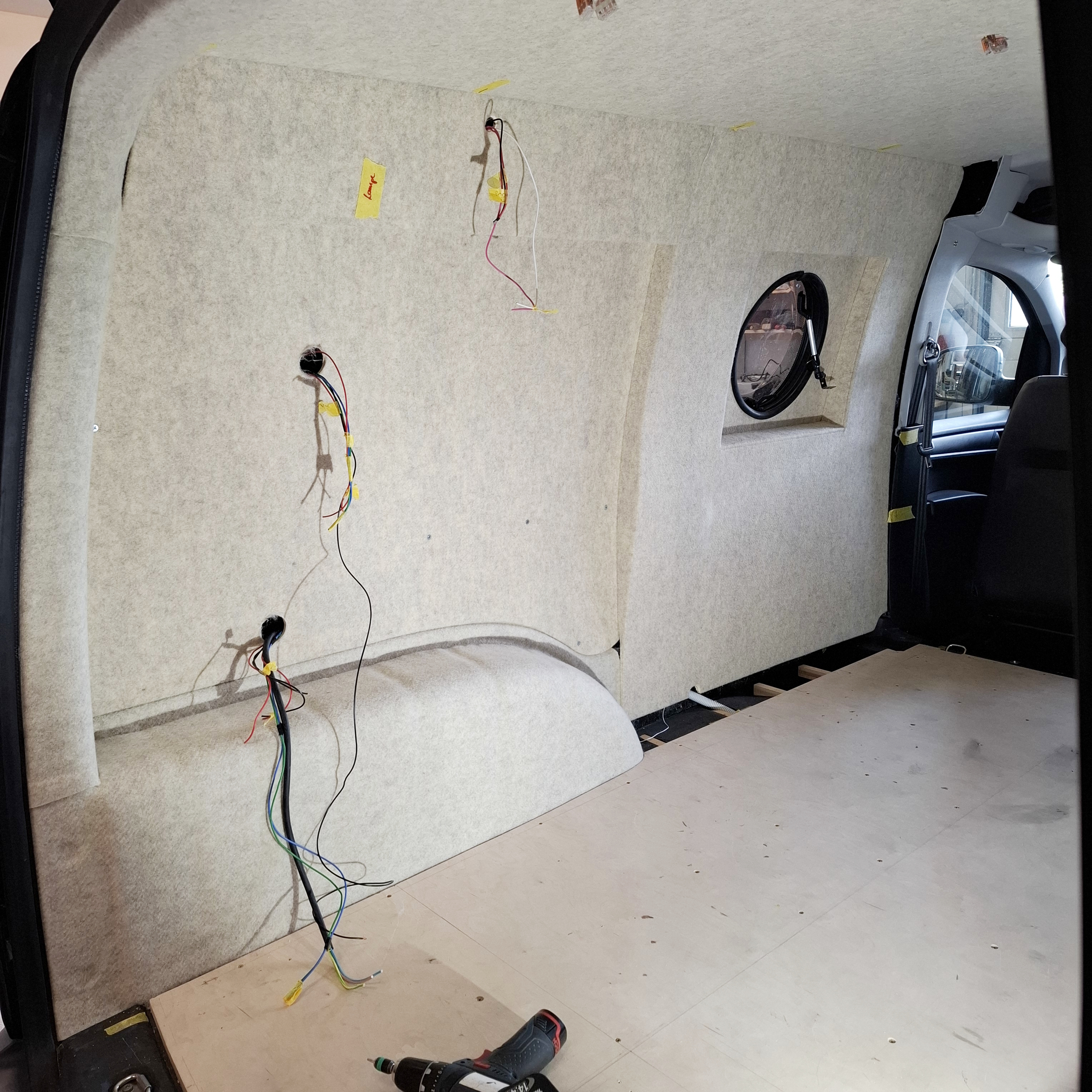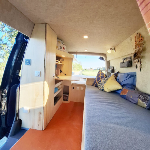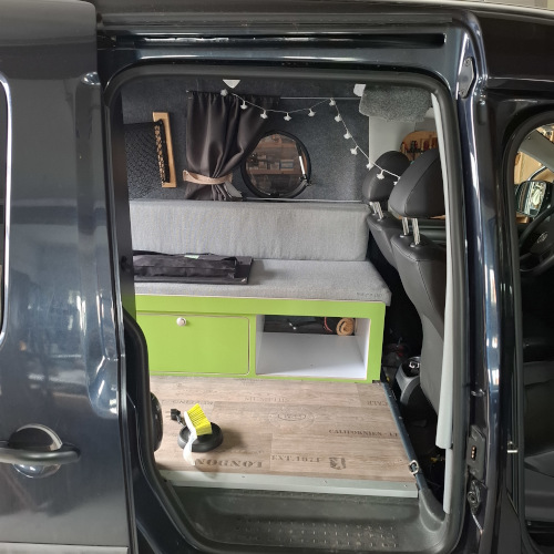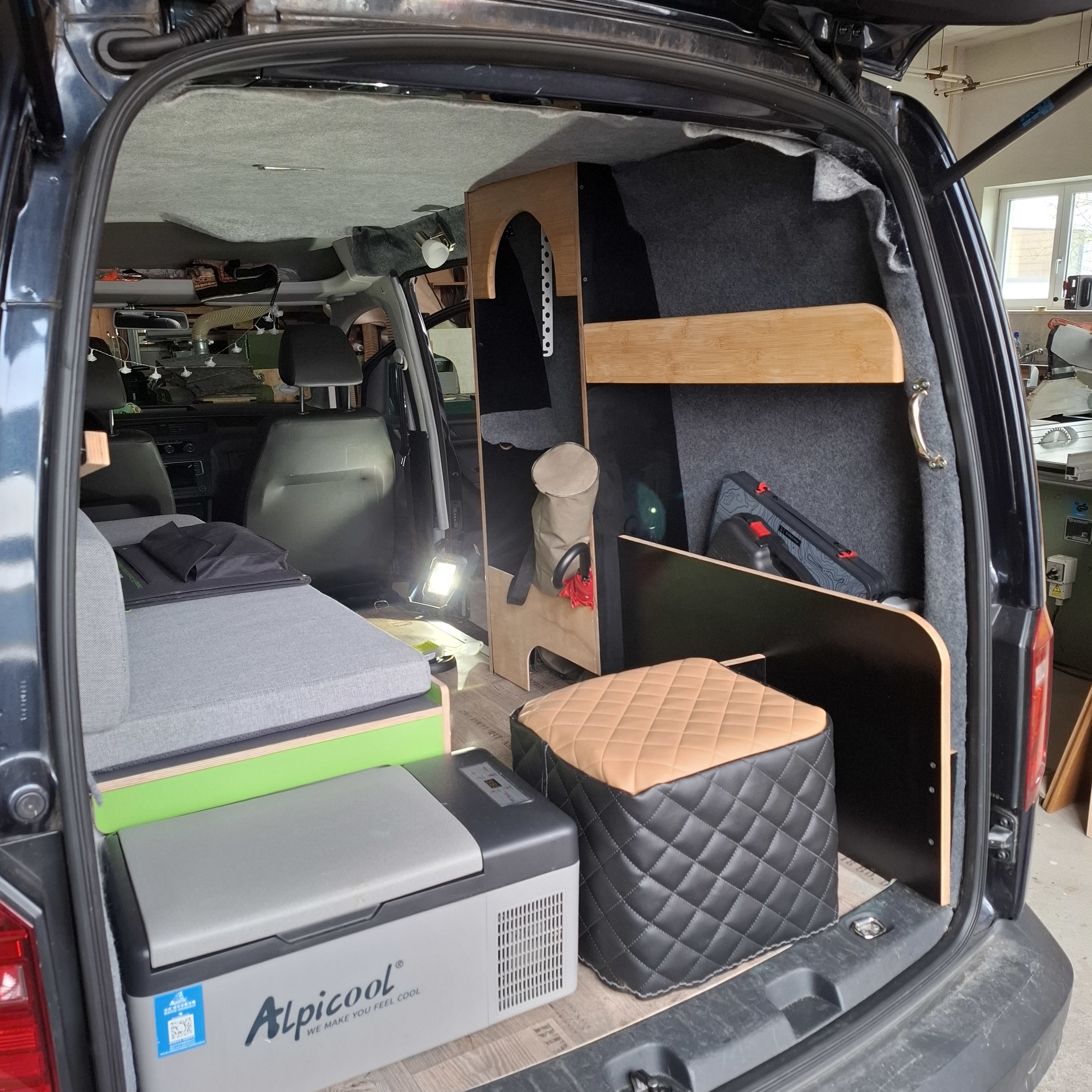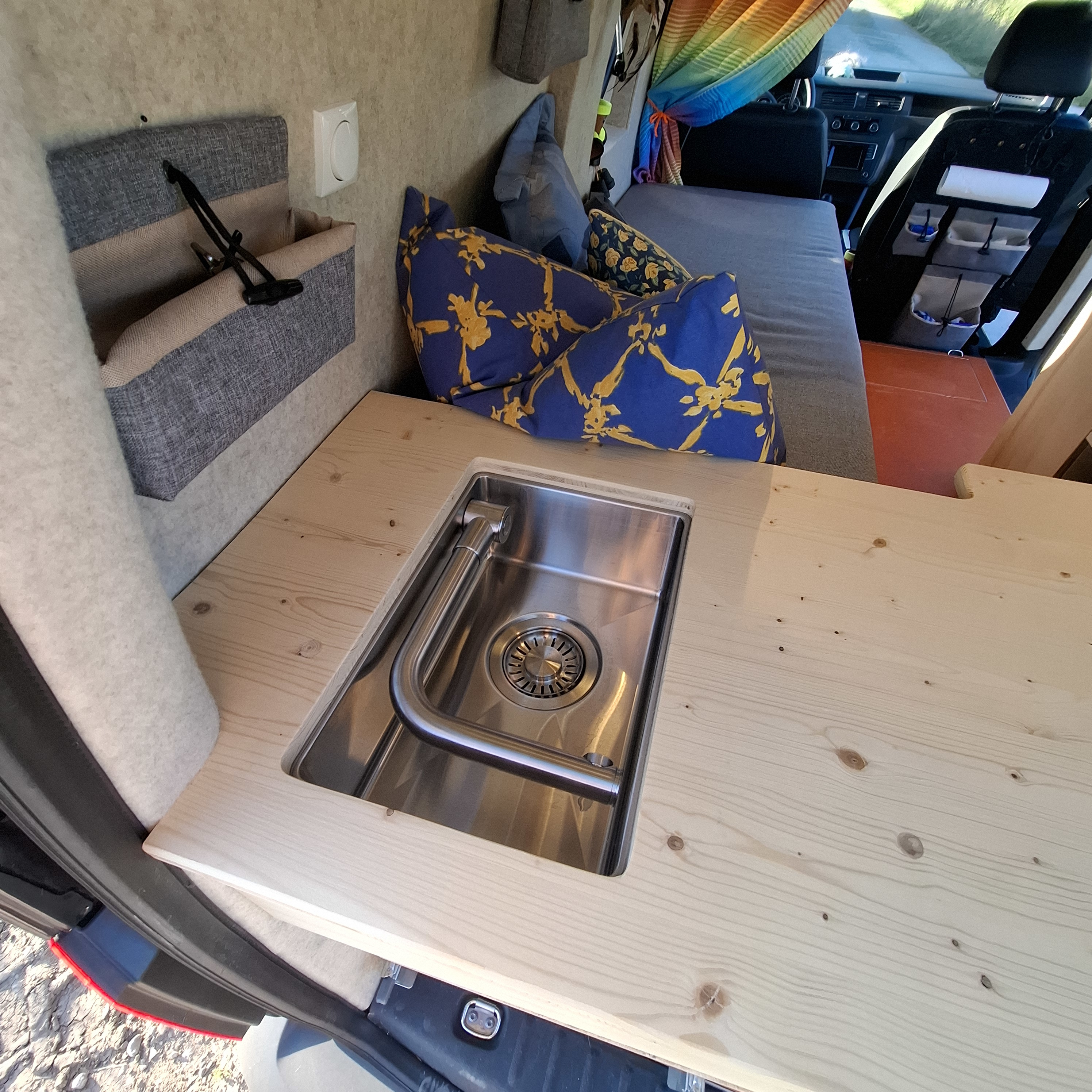 Die Seitenwände und der Himmel wurden von uns isoliert, mit Pappelsperrholz verkleidet und mit einem freundlichen, hellen Filz beklebt.